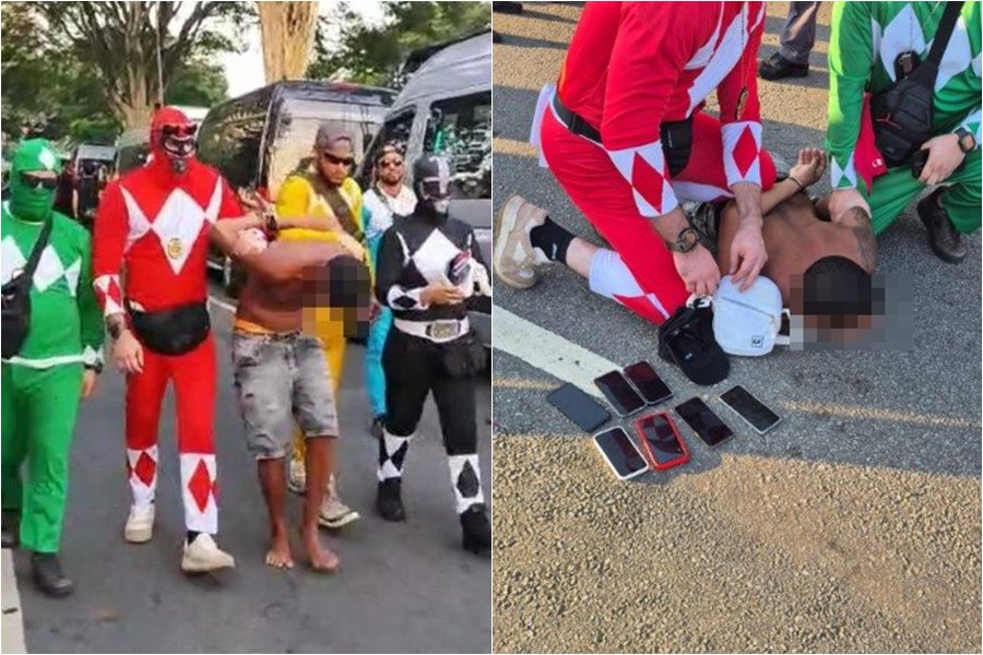 VÍDEO: 'Power Rangers' prendem homem com 7 celulares em bloco no Carnaval