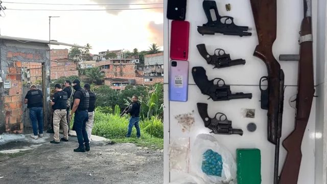 Durante a ação foram apreendidos uma espingarda de fabricação artesanal, um rifle calibre 22, três revólveres calibres 38 e 32, uma pistola Taurus calibre 765, um saco, um tablete e 43 porções de maconha, 127 pinos de cocaína e 121 embalagens contendo crack.