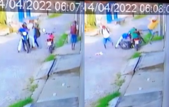 Pelas imagens é possível perceber a vítima chegando na porta da casa, enquanto a dupla passa na outra rua e percebe o homem estacionando a moto. Em seguida, eles voltam e abordam a vítima com uma faca, que reage e momentos depois, a outra pessoa, que estava dentro da casa, entra na luta corporal com a dupla de criminosos.