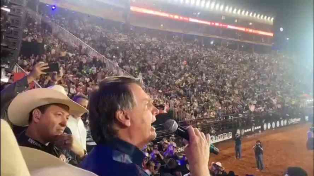 Bolsonaro chegou ao estádio por volta das 20h e permaneceu por uma hora, aparecendo algumas vezes no telão e sendo ovacionado pelas arquibancadas lotadas. Ele se aproximou da área dos animais, tropeçou, caiu e foi rapidamente ajudado por aliados. Após alguns momentos descontraídos perto do ponto de partida dos rodeios, ele fez um discurso.