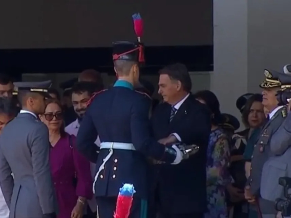Bolsonaro fez a entrega de uma medalha e uma espada a um aluno condecorado na cerimônia, mas não fez discursos.