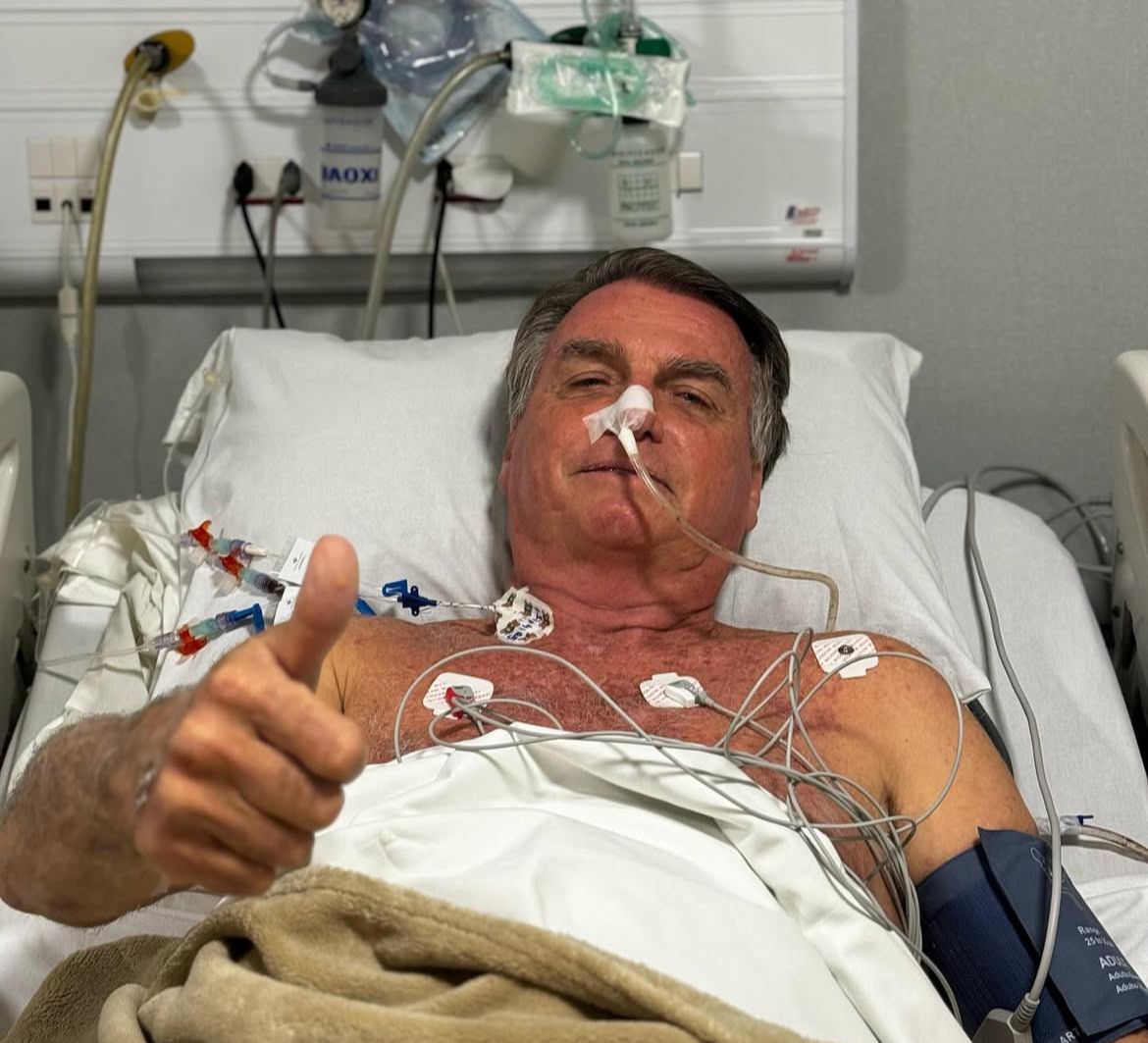 O ex-presidente Jair Bolsonaro (PL) divulgou nesta quarta-feira (10) uma foto em que aparece internado no Hospital Rio Grande, em Natal (RN), e informou que precisou ser hospitalizado após sentir fortes dores abdominais durante compromissos no interior do estado.
