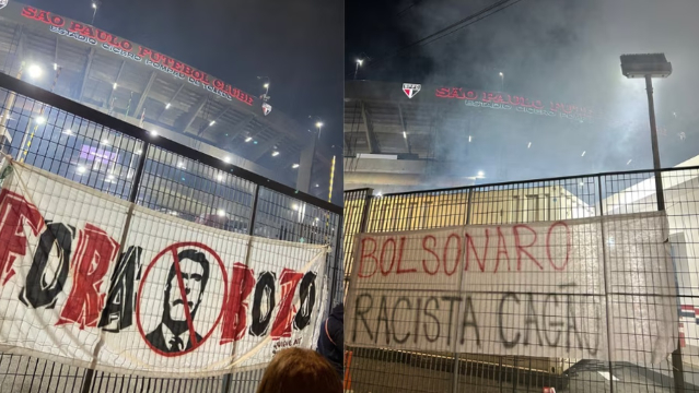 A torcida organizada, Bonde do Che, confeccionou faixas de protesto contra a presença do ex-presidente no local. As fotos compartilhadas pela torcida mostram mensagens que chamam o ex-presidente de “porco genocida”, “porcú maldito”, “Fora Bozo”, “Bolsonaro racista cagão”, entre outras.