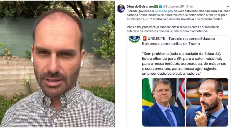 O deputado federal licenciado Eduardo Bolsonaro (PL-SP) criticou nesta terça-feira (15), por meio de uma rede social, a postura do governador de São Paulo, Tarcísio de Freitas (Republicanos), diante das tarifas de 50% impostas pelo presidente dos Estados Unidos, Donald Trump, sobre produtos brasileiros.