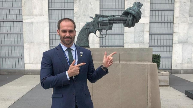 Subindo em um carro de som, Eduardo disparou: "Temos que nos preocupar com a figura do professor doutrinador, aquele que tenta sequestrar e levar nossos filhos para o mundo do crime. Talvez até mesmo o professor doutrinador seja pior". Um dos coordenadores do evento foi o deputado Marcos Pollon (PL-MS), que enalteceu a presença de Eduardo, chamando-o de "01" na defesa da flexibilização das armas. Os manifestantes vestiam camisetas brancas com a frase "não é sobre armas, é sobre liberdade".