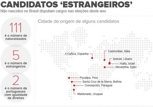 Cento e onze políticos que não nasceram no Brasil mas adotaram o país como pátria vão disputar as eleições deste ano. São candidatos que se naturalizaram brasileiros. Além deles, há dois portugueses com igualdade de direitos e cinco estrangeiros com dupla nacionalidade no pleito, segundo dados do Tribunal Superior Eleitoral (TSE).