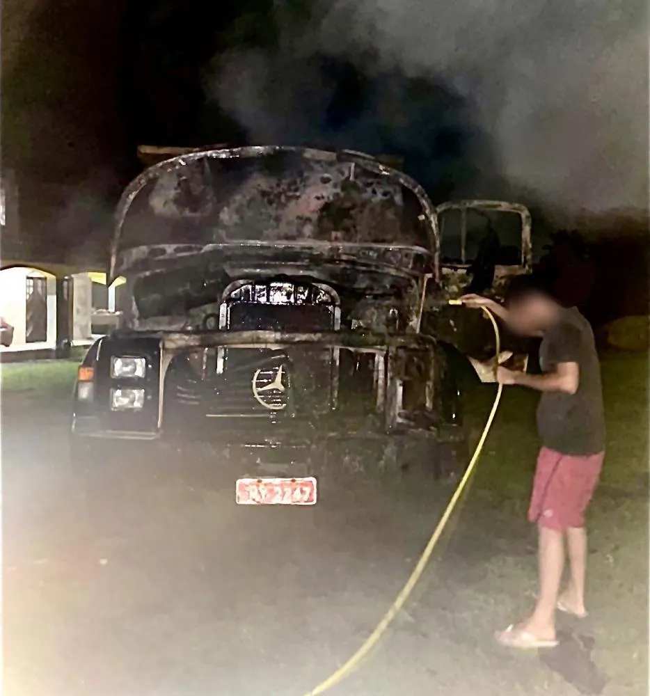 Na madrugada desta terça-feira (13), o caminhão do ex-vereador e atual candidato Sérgio Bogoio foi incendiado em sua residência, localizada no bairro do Bom Jesus, em Mata de São João, Bahia. Vídeos que circulam nas redes sociais mostram o veículo, um Mercedes, em meio às chamas.