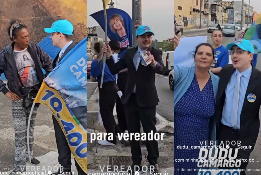 Dudu Camargo (Republicanos), candidato a vereador de São Paulo, está fazendo campanha nas ruas, mantendo seu visual característico de terno e gravata, que é sua marca registrada desde os tempos em que atuava na TV. Em vídeos compartilhados nas redes sociais, ele busca votos ao lado de eleitores que se acostumaram a vê-lo no "Primeiro Impacto", telejornal do SBT que foi reformulado com foco em notícias policiais.