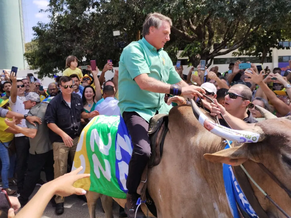 Ele desembarcou no município pernambucano por volta das 9h30, onde cumprimentou apoiadores e montou em um touro. Adesivos da campanha de Bolsonaro foram colados nos chifres do animal. Na sequência, Bolsonaro participou de um passeio de moto com apoiadores com destino a Juazeiro.