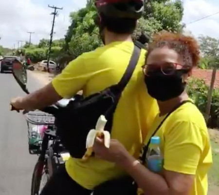 Lucineide foi filmada tranquilamente na garupa de uma bicicleta com uma banana e uma garrafa de água mineral.