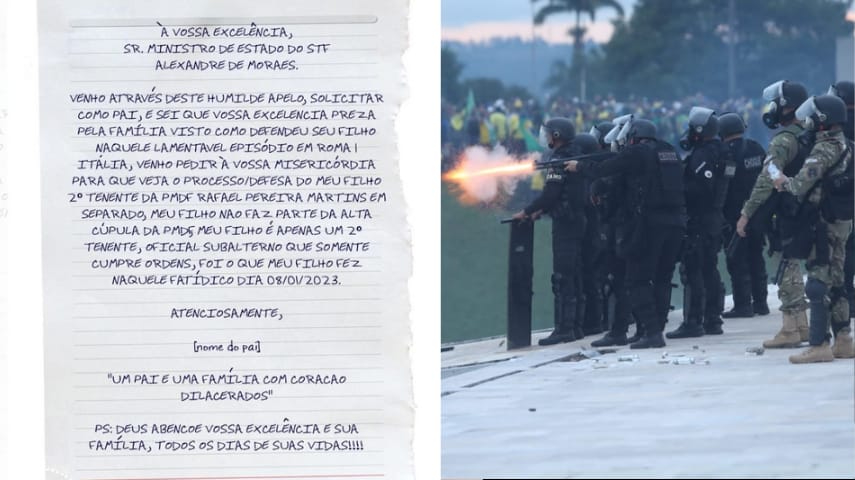 O pai de um dos policiais militares detidos na investigação que apura omissão no evento de 8 de janeiro redigiu uma carta à mão endereçada ao ministro Alexandre de Moraes, solicitando "misericórdia". O texto foi redigido pelo pai do tenente Rafael Pereira Martins, que foi detido junto à cúpula da Polícia Militar do Distrito Federal (PMDF) em agosto de 2023.