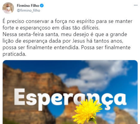 "É preciso conservar a força no espírito para se manter forte e esperançoso em dias tão difíceis. Nessa sexta-feira santa, meu desejo é que a grande lição de esperança dada por Jesus há tantos anos, possa ser finalmente entendida. Possa ser finalmente praticada.", publicou.