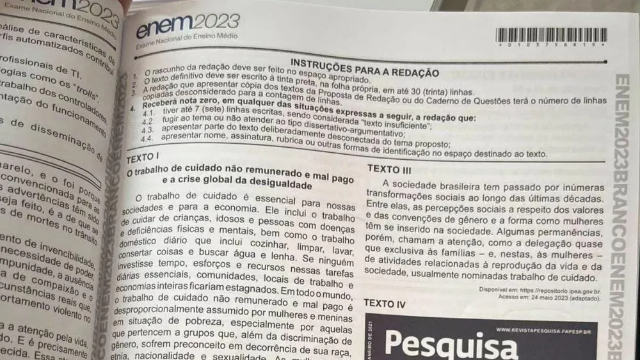 A imagem que está circulando na internet mostra a página da redação do Enem 2023, que teve como tema "Desafios para o enfrentamento da invisibilidade do trabalho de cuidado realizado pela mulher no Brasil", juntamente com os textos de apoio. Nas postagens, não é possível determinar o horário em que a foto foi capturada e divulgada.