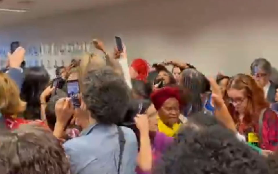 O grupo protestava com palavras de ordem, como "criança não é mãe, estuprador não é pai". Diante da dificuldade em retirar os ativistas do local, a presidente da CCJ, deputada Caroline de Toni (PL-SC), optou por suspender a sessão por 15 minutos.