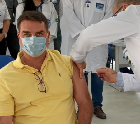 O senador Flávio Bolsonaro (Patriota-RJ) postou um vídeo em suas redes sociais, nesta quinta-feira (22), recebendo a primeira dose da vacina contra a Covid-19. Nas imagens, o ministro da Saúde, Marcelo Queiroga é quem aplica a vacina da Astrazeneca/Fiocruz, produzida no Rio de Janeiro.