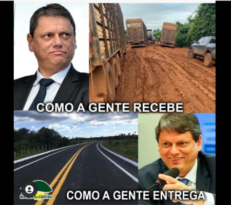 Uma postagem viral no Facebook engana ao comparar imagens de rodovias diferentes, com o objetivo de atribuir a conclusão de obras de infraestrutura ao governo federal. A figura mostra uma foto de veículos em uma via enlameada, seguida de outra que retrata um trecho asfaltado. Há também duas imagens do ministro da Infraestrutura, Tarcisio de Freitas, acompanhadas das mensagens “como a gente recebe” e “como a gente entrega”.
