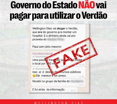 O governador Wellington Dias (PT) desmentiu na tarde desta quinta-feira, 02 de abril, a notícia falsa que circula nas redes sociais dando conta de que o Governo estaria pagando uma espécie de aluguel para usar o espaço do Ginásio Verdão como hospital de campana.  A mensagem replicada em aplicativos como o WhatsApp é mentirosa, e surge no momento em que o Estado luta contra a pandemia do novo coronavírus.