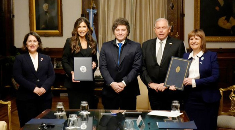 O presidente argentino recebeu na Casa Rosada a secretária de Segurança Nacional dos EUA, Kristi Noem. Milei tem reforçado laços com o governo de Donald Trump, com quem compartilha afinidades ideológicas.