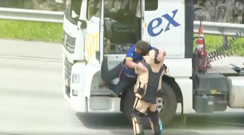 O caminhoneiro, que aparentava estar muito abalado, conversou com policiais poucos instantes antes de desmaiar na pista.