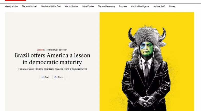 A revista The Economist descreveu o julgamento como sem precedentes e afirmou que o Brasil estaria dando “uma lição de democracia” aos norte-americanos, além de classificar os atos de 8 de janeiro de 2023 como “estranhos e bárbaros”. Já o New York Times questionou se a Corte atua como guardiã da democracia ou se extrapola sua função, ressaltando que a pressão de Trump teria apenas reforçado a firmeza do governo brasileiro.