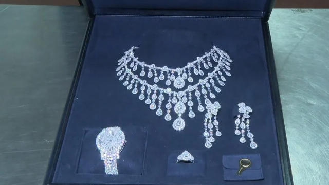 O conjunto é composto por colar, anel, relógio e um par de brincos de diamantes. Segundo a inspeção, as joias contêm três mil diamantes, todos naturais e verdadeiros.