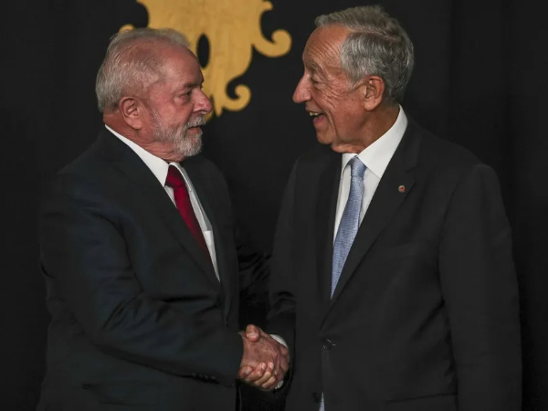 Lula com o presidente de Portugal, Marcelo Rebelo, durante encontro na sexta-feira (18). — Foto: CARLOS COSTA / AFP