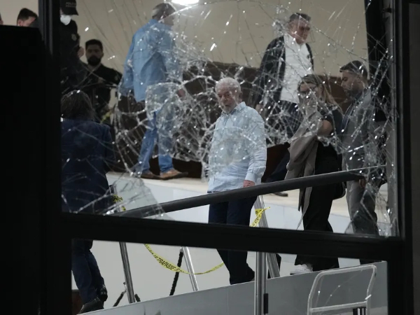 Lula visitou primeiramente o Planalto. O presidente encontrou o mobiliário destruído, vidraças quebradas e obras de arte rasgadas.