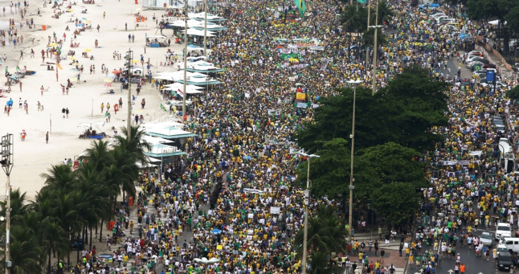 No Rio de Janeiro, 15 mil pessoas ocuparam a faixa de areia e a pista da orla de Copacabana e caminham em direção ao Leme. Ao todo, 850 policiais acompanham o protesto, entre eles 250 do Batalhão de Grandes Eventos.