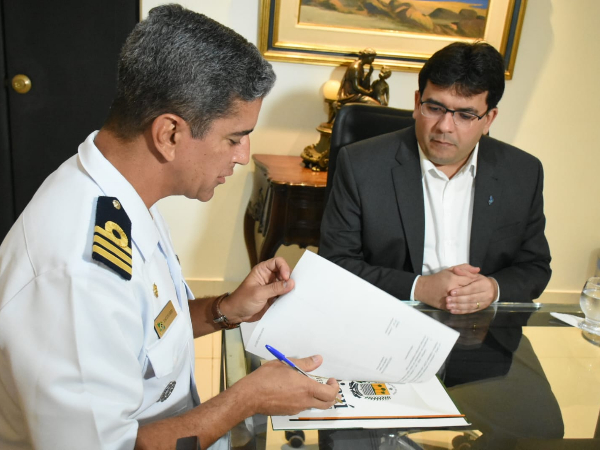 O governador Rafael Fonteles recebeu, na tarde desta segunda-feira, 13, no Palácio de Karnak, o Capitão de Fragata, José Eduardo, que comanda a Capitania dos Portos de Parnaíba. Na ocasião, o comandante entregou documento em que a Marinha do Brasil autoriza as obras e o funcionamento do Porto de Luís, o Porto do Piauí.