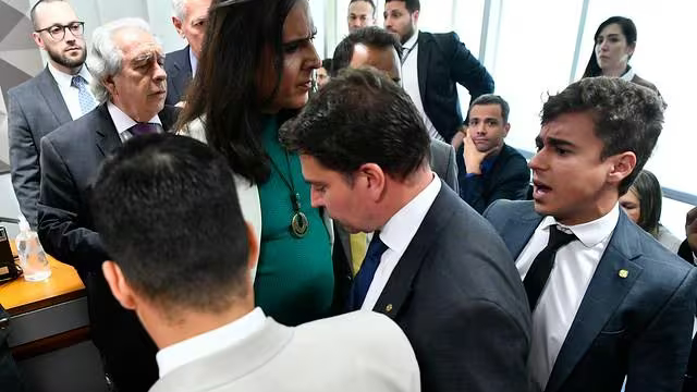Os parlamentares estavam em um canto do plenário deliberando sobre a inclusão de requerimentos em blocos, um procedimento que possibilita a aprovação ou rejeição de múltiplas solicitações de uma vez. No entanto, parece que não houve consenso entre aliados do governo Lula (PT), apoiadores de Jair Bolsonaro (PL) e a mesa diretora da comissão.