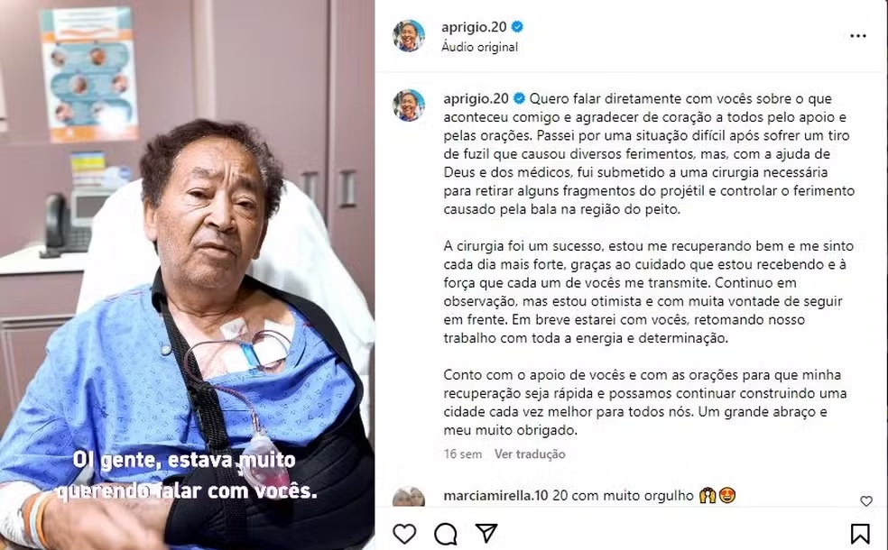 A equipe do político relatou que o impacto do disparo fraturou sua clavícula e estilhaços ficaram alojados em seu corpo. Aprígio foi socorrido e levado a uma unidade de saúde local antes de ser transferido para o Hospital Albert Einstein, em São Paulo. Ainda internado, ele gravou um vídeo para tranquilizar seus apoiadores.