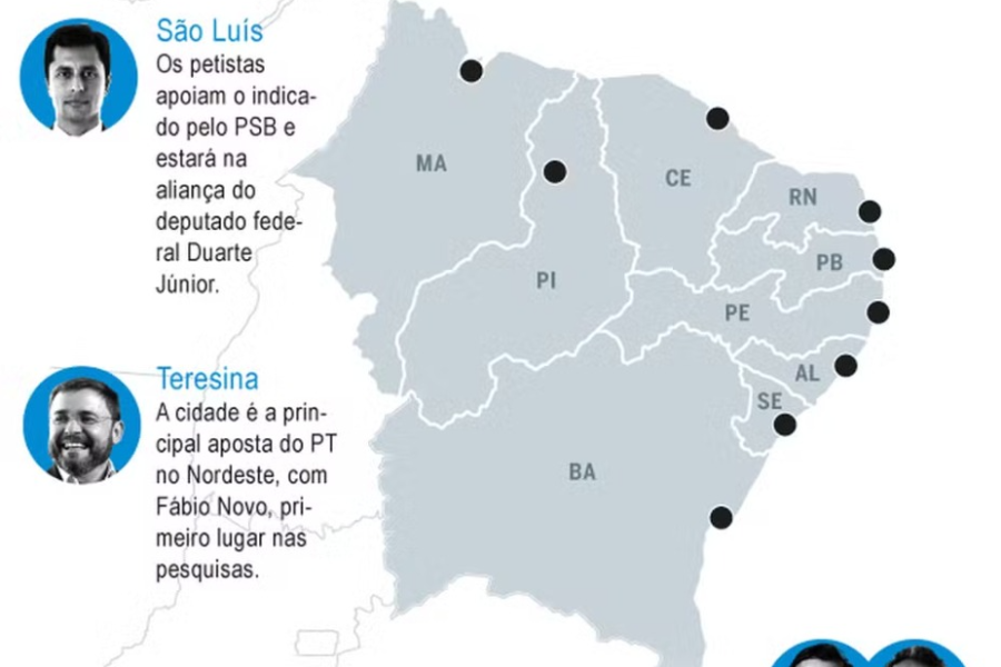 Internamente, a maior aposta está em Teresina, com o deputado estadual Fábio Novo — Lula já disse que participará ativamente da campanha do aliado. A cidade, atualmente comandada por Dr. Pessoa (PRD), que vai tentar a reeleição, tem um histórico de prefeitos tucanos e nunca teve um gestor de esquerda.