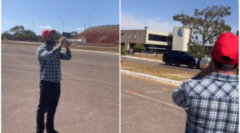 A performance foi feita por Fabiano e Silva Leitão Duarte, de 45 anos, conhecido como TromPetista, que já havia feito o mesmo gesto em março deste ano, na saída do Senado, quando Bolsonaro também dava entrevista após se tornar réu no Supremo Tribunal Federal (STF) por tentativa de golpe de Estado.