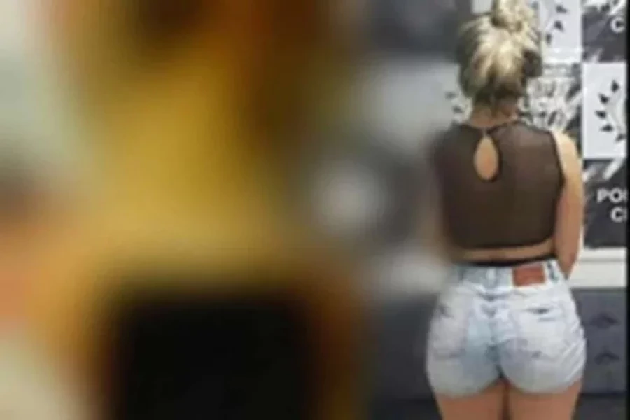 A imagem divulgada mostra uma jovem loira de short curto, de costas e dentro de uma delegacia, tentando dar veracidade à reportagem.