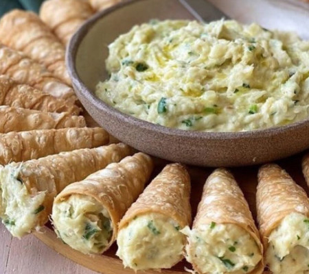 Assim que esfriar, recheie os canudinhos com o frango e o queijo!