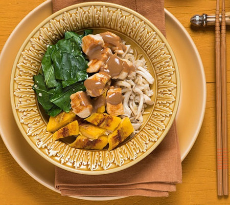 17. Coloque a mistura de pasta de amendoim e shoyu na frigideira, raspando bem o fundo com a espátula para dissolver os queimadinhos do frango.