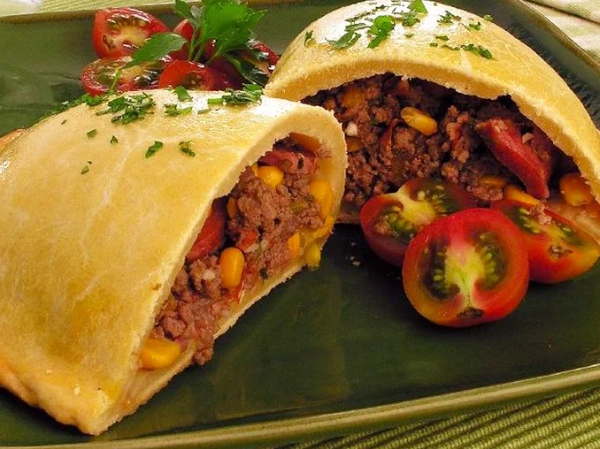 - Abra a massa com um rolo, distribua o recheio, e feche bem, formando uma meia-lua.