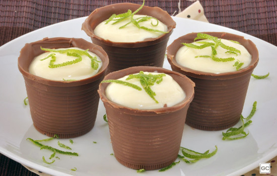 - Retire da geladeira e, com cuidado, com uma tesoura, corte os copinhos de plástico e retire os copinhos de chocolate.