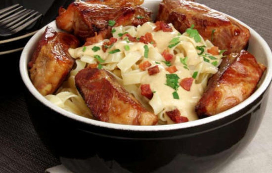 - Sirva o fettuccine acompanhado do molho, do bacon e das costelas.