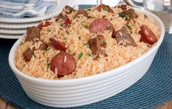Arroz com carne e linguiça para uma refeição completa. Veja a receita