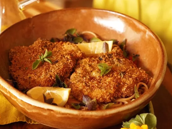 Bisteca suína empanada com espaguete