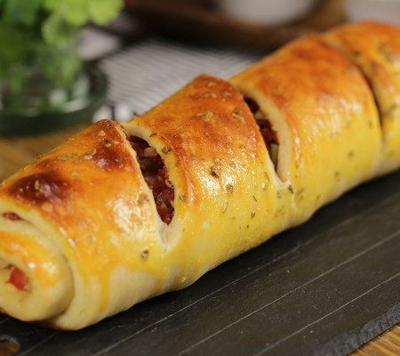 Na vasilha com a massa, adicione a mussarela, o presunto, a calabresa, a cebola e o tomate. Misture bem até ficar homogêneo;
