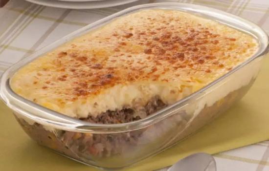 - Em um refratário médio, faça uma camada com a carne moída e cubra com o purê.