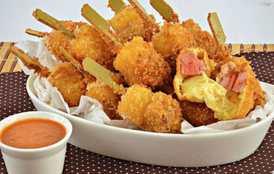 - Passe pela farinha de trigo, pelos ovos batidos, pela farinha panko e frite em óleo quente até dourar.