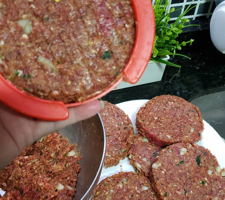 Depois de tudo bem misturado, modele os hambúrgueres com as mãos ou com o auxilio de um aro.