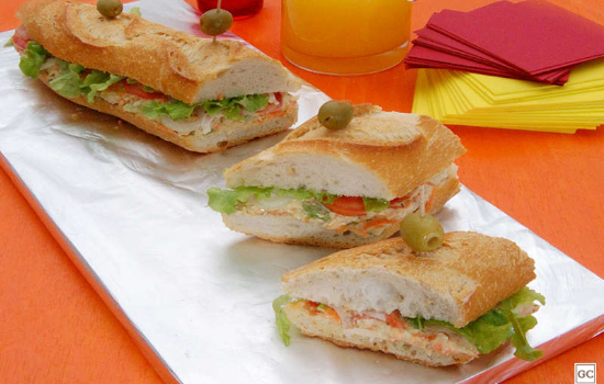 - Abra o pão de metro, passe o patê de frango já temperado, coloque em cima as fatias de tomate, a cebola, a alface picada e feche o pão.