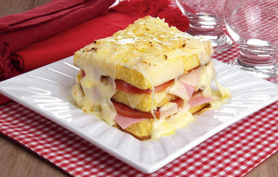 - Em um refratário médio untado, faça camadas de pão, de muçarela, de presunto e de tomate temperado com sal e orégano, repetindo as camadas até acabarem os ingredientes, terminando em pão.