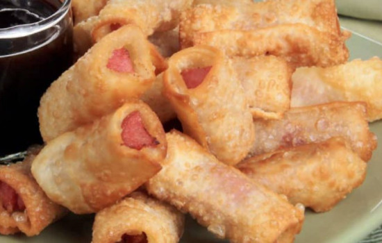 - Coloque um pedaço de calabresa sobre cada pedaço de massa de pastel e enrole como rocambole, prendendo as pontas para dentro. Aperte levemente para fechar e prenda com palitos.