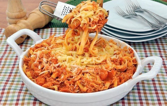 Macarrão com frango desfiado e queijos