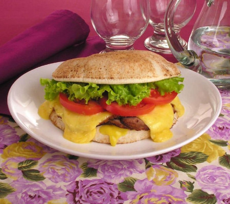 - Abra o lanche, disponha as fatias de tomate, a alface e sirva.